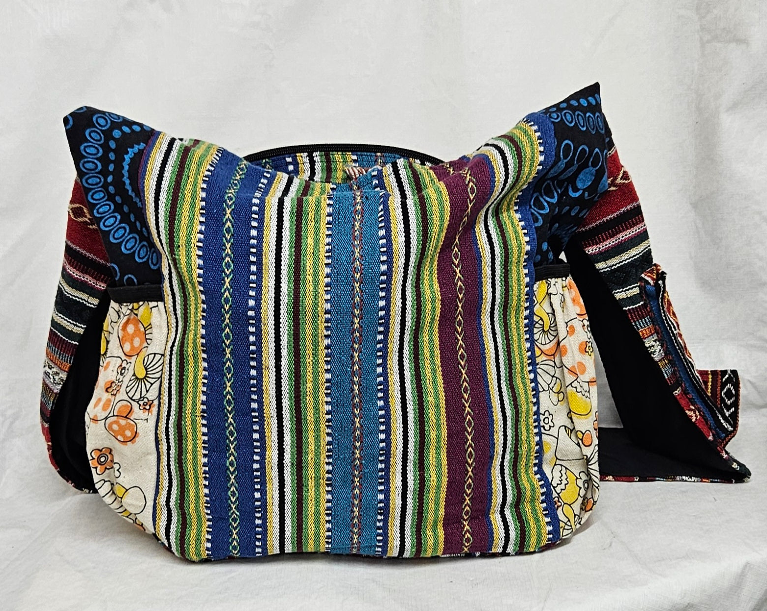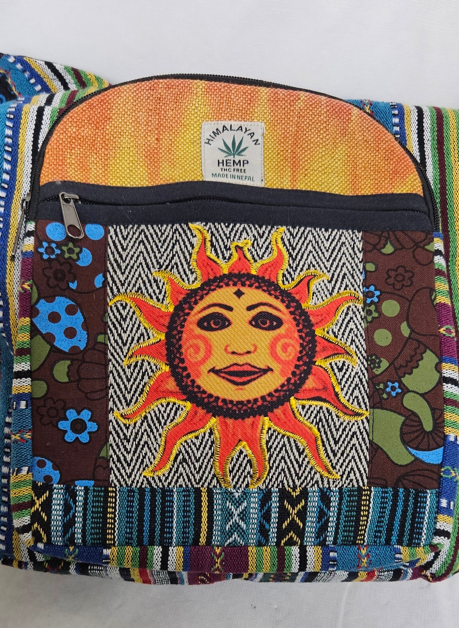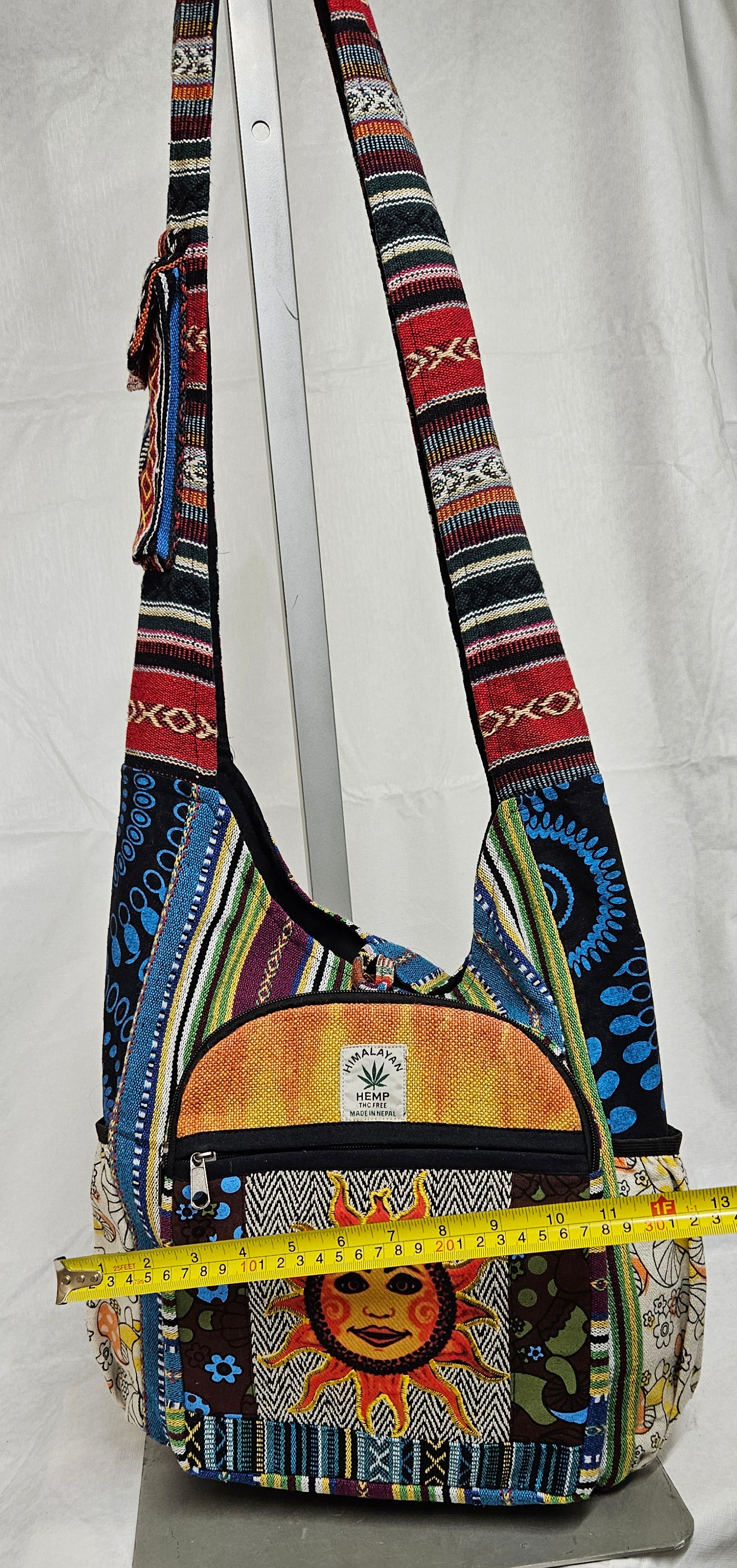 Large Bohemian Himalayan Hemp Hobo Style Purse/Bag with A Large Sun on the Front. This Bag features 2 side pockets, 2 front zippered pockets and a pocket on the strap.