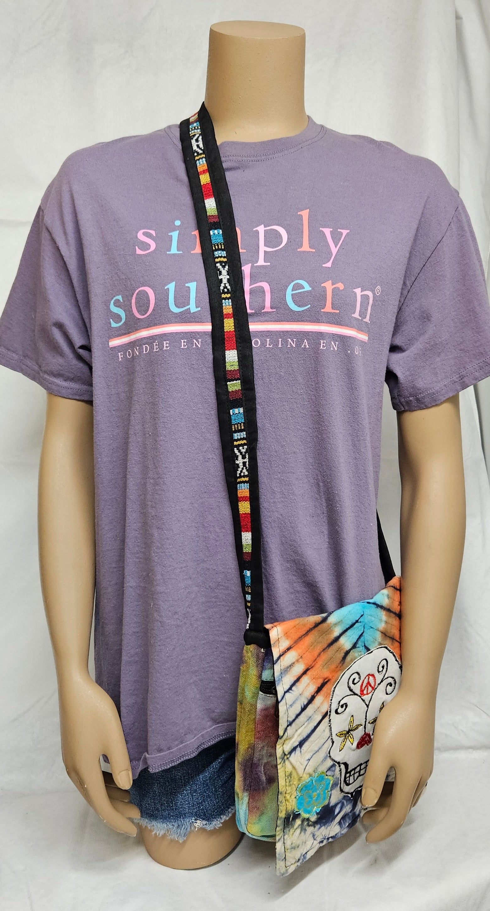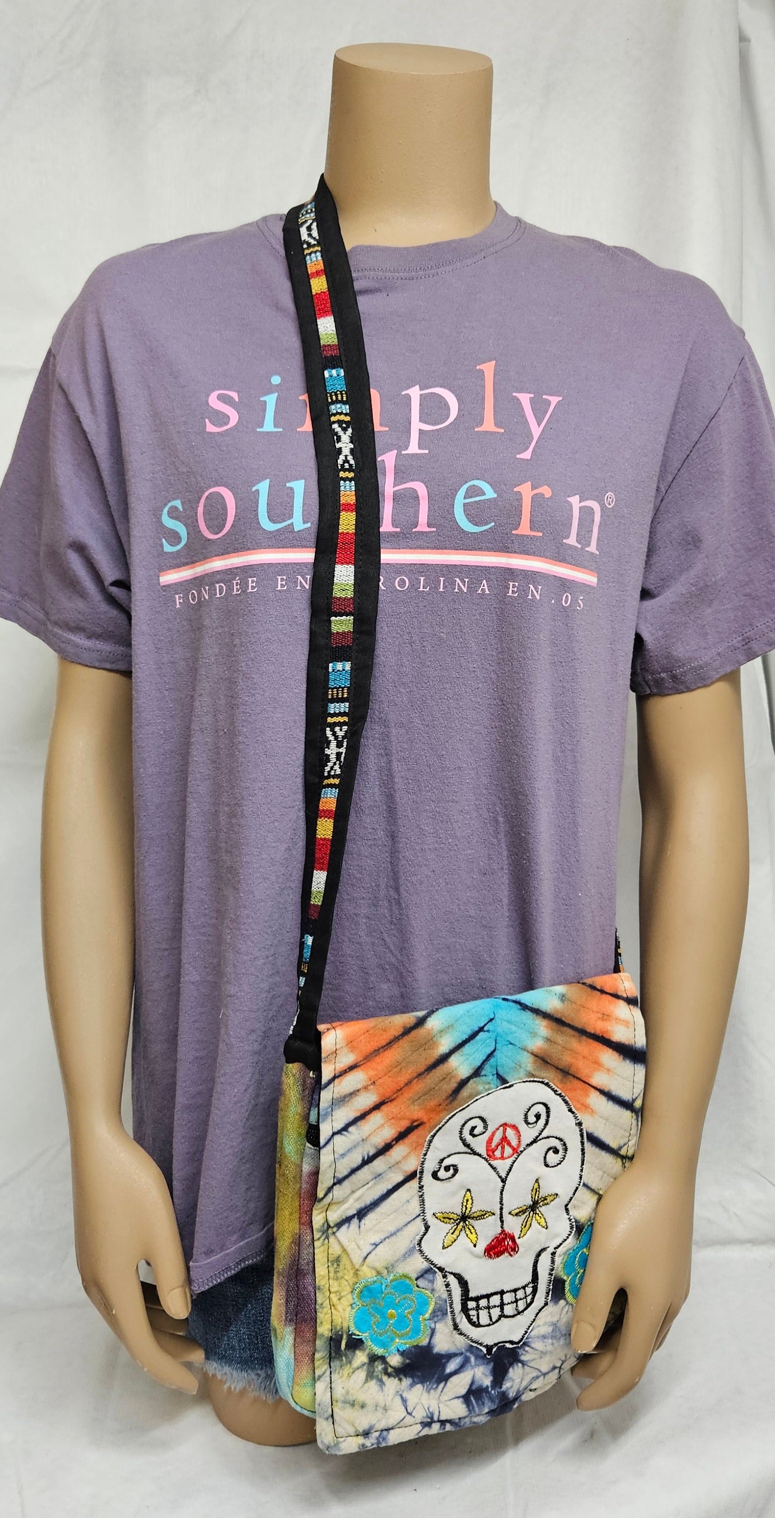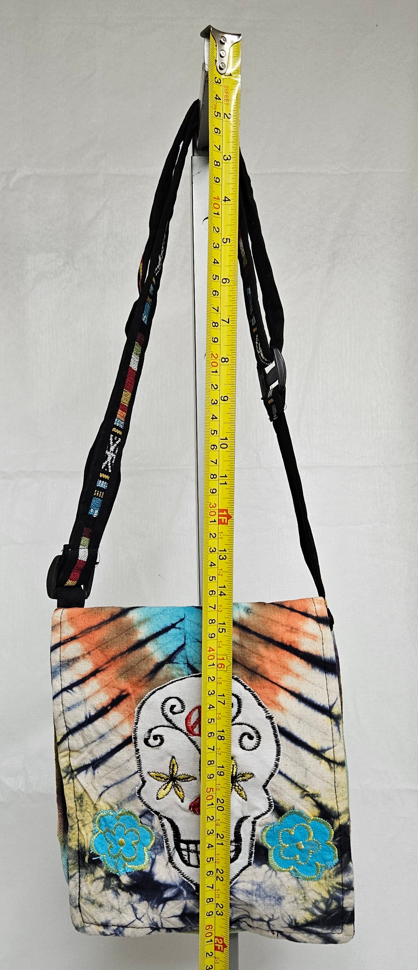 Cotton Purse with a Skull and two flowers/A Hemp Bag with Front Flap and Adjustable Strap