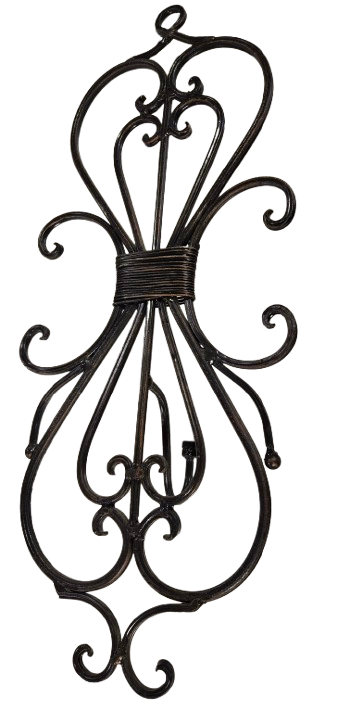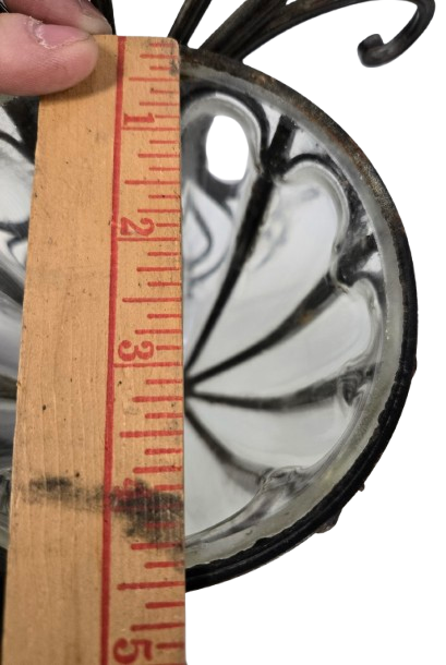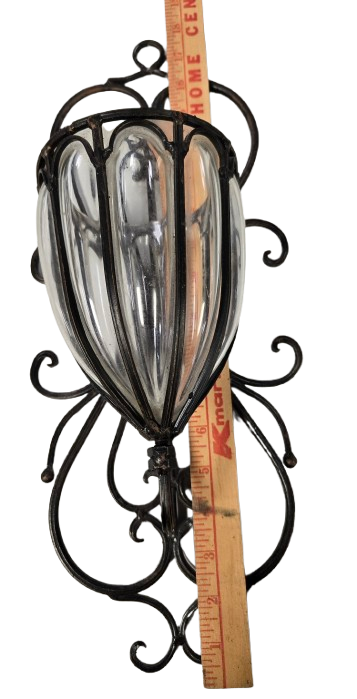 This vintage wall sconce combines a hand-blown or molded glass insert with an intricately scrolled wrought or cast iron frame. Designed for versatility, it can be used as a vase, planter, or decorative accent, adding an elegant and timeless touch to your interior space. The sturdy iron framework ensures durability while highlighting the artistic glass centerpiece. Ideal for those who appreciate craftsmanship and classic design details.