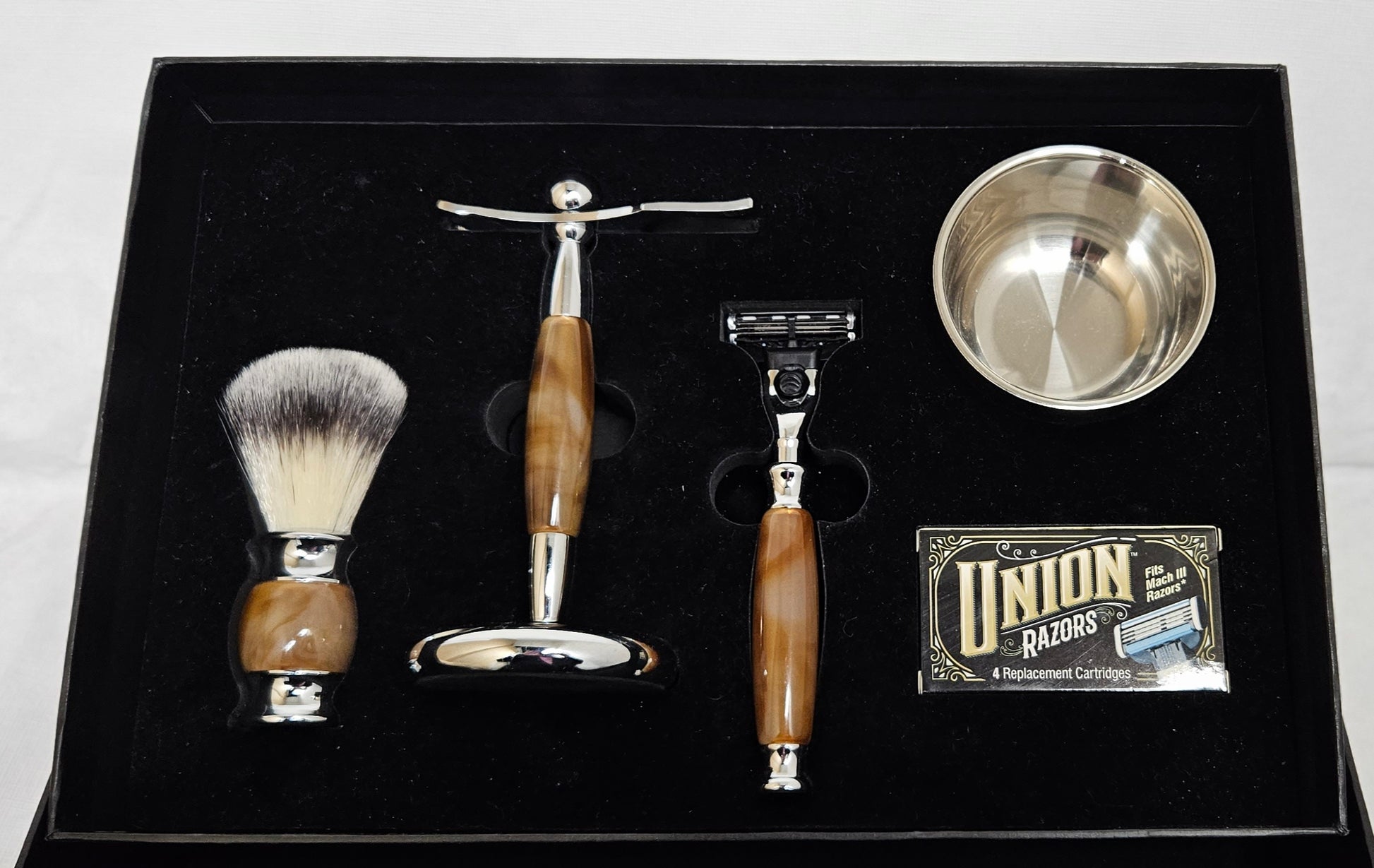 Set includes: Stainless Steel Bowl/Soft Bristle Brush/Razor Handle "Mach III Compatible"/Matching Tiger Eye Stand and Box of 4 Replacement Cartridges Included