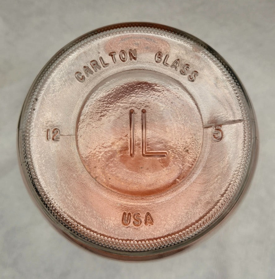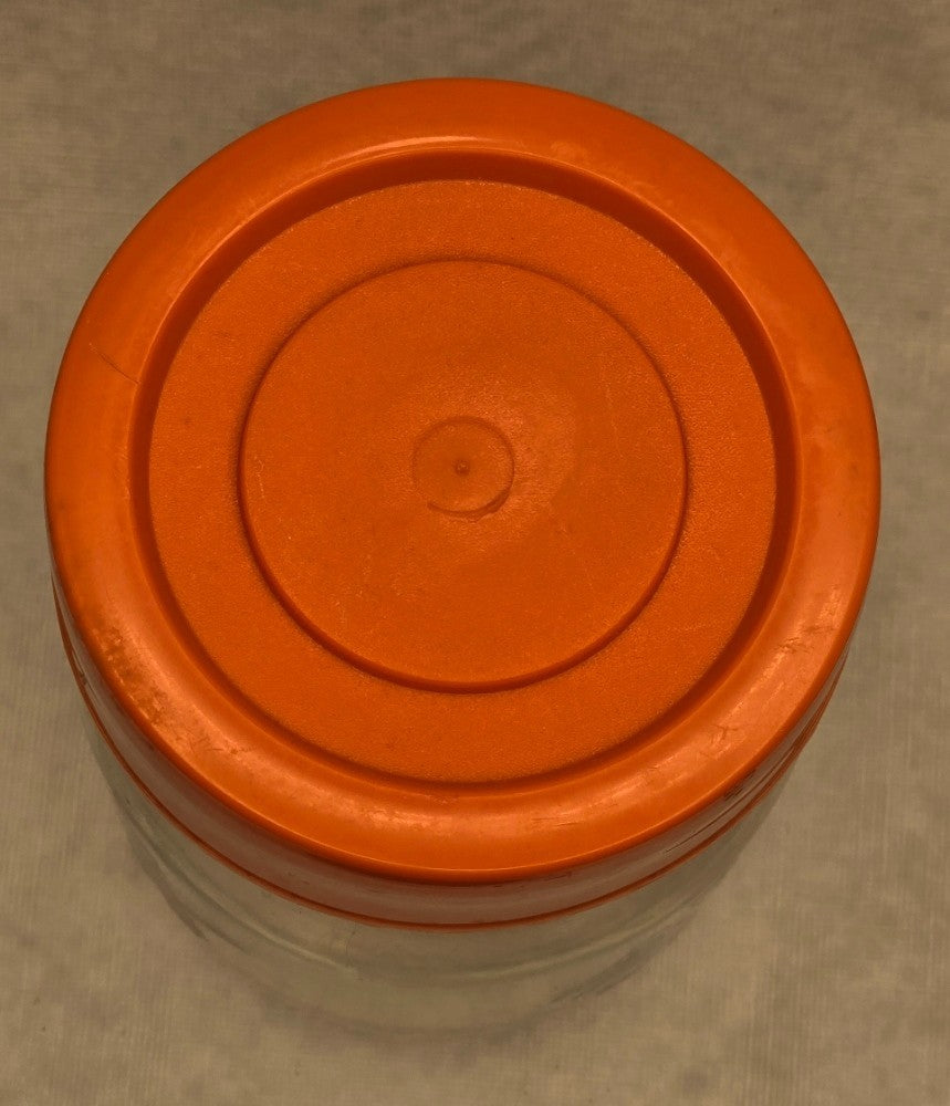- Clear glass with vibrant orange screw-top lid